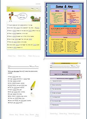 Aqui estão 4 fichas de trabalho relacionadas com some e any.A ficha 1, ficha 3 e ficha 4 foram elaboradas por mim e a ficha 2 (a mais colorida) foi retirada do ESL printables.